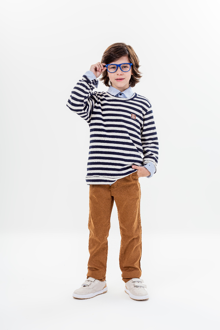 Conheça o Conjunto Menino 3 peças: Camisa, Calça Sarja e Blusa Listrada em Malha!